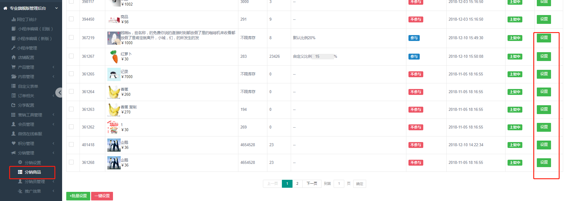 分销商品这里会同步显示产品列表那里所有的商品信息。但是商品是否参加分销,需要在分销商品那里设置,每个商品的分销佣金,可以设置默认佣金比例,也可以设置自定义设置不同的商品不同的佣金比例