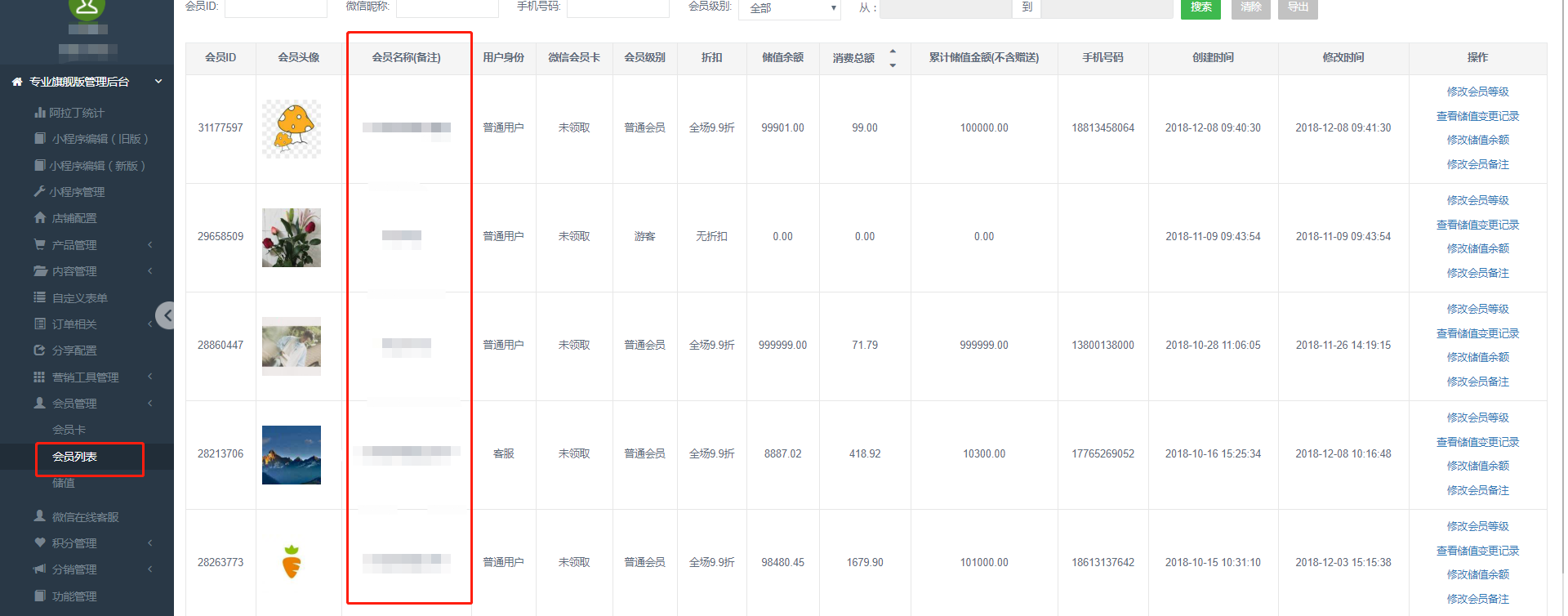 成为会员的信息全部都会显示在会员列表这里,在这里可以编辑会员备注,修改储值余额,手动修改会员等级