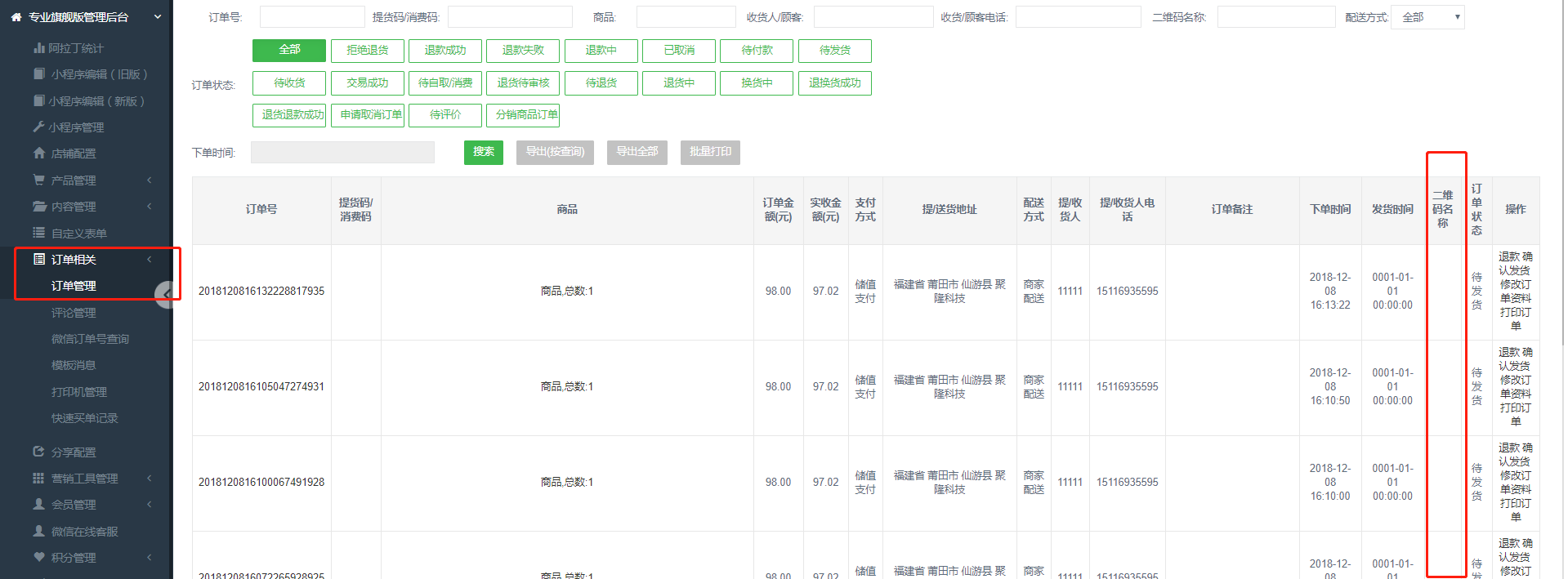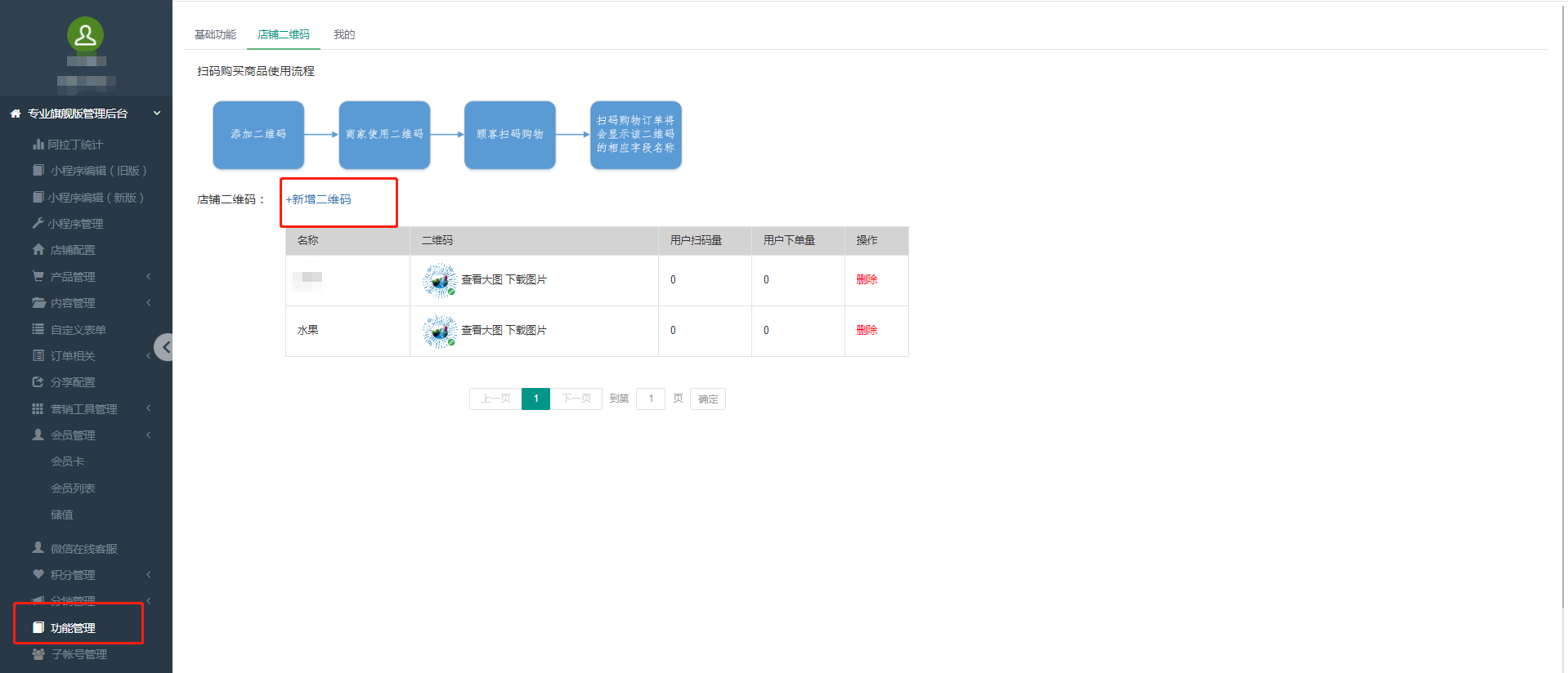 2.客户进入小程序,点击设置扫码购买的那里,进入扫码阶段,扫码打印好的店铺二维码,之后完成下单,之后在订单管理那里就会显示是从那个二维码进入下单的