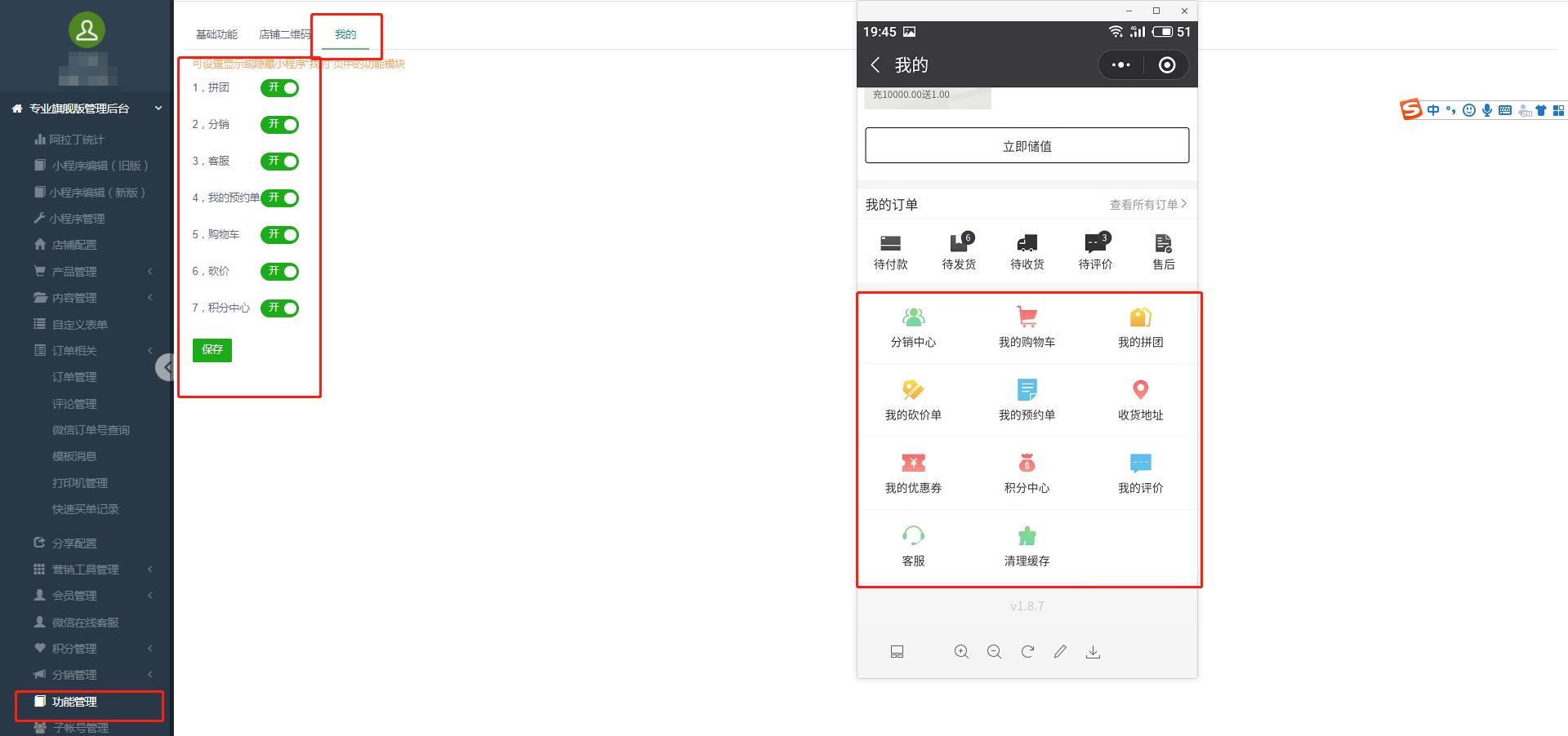 专业版有一个默认的""我的”界面,后台可以控制“我的”界面显示哪些功能