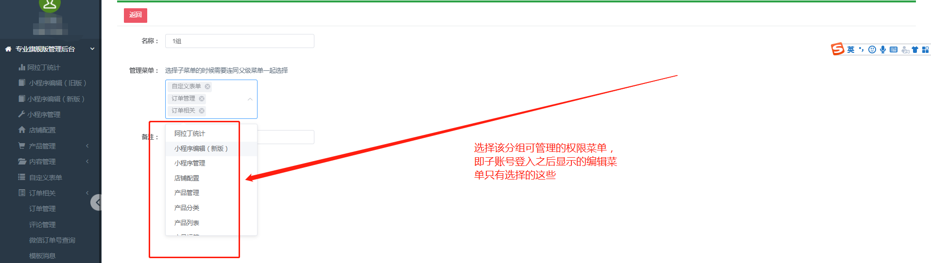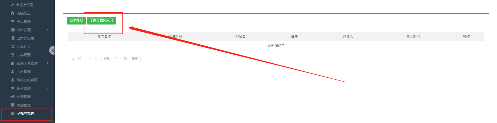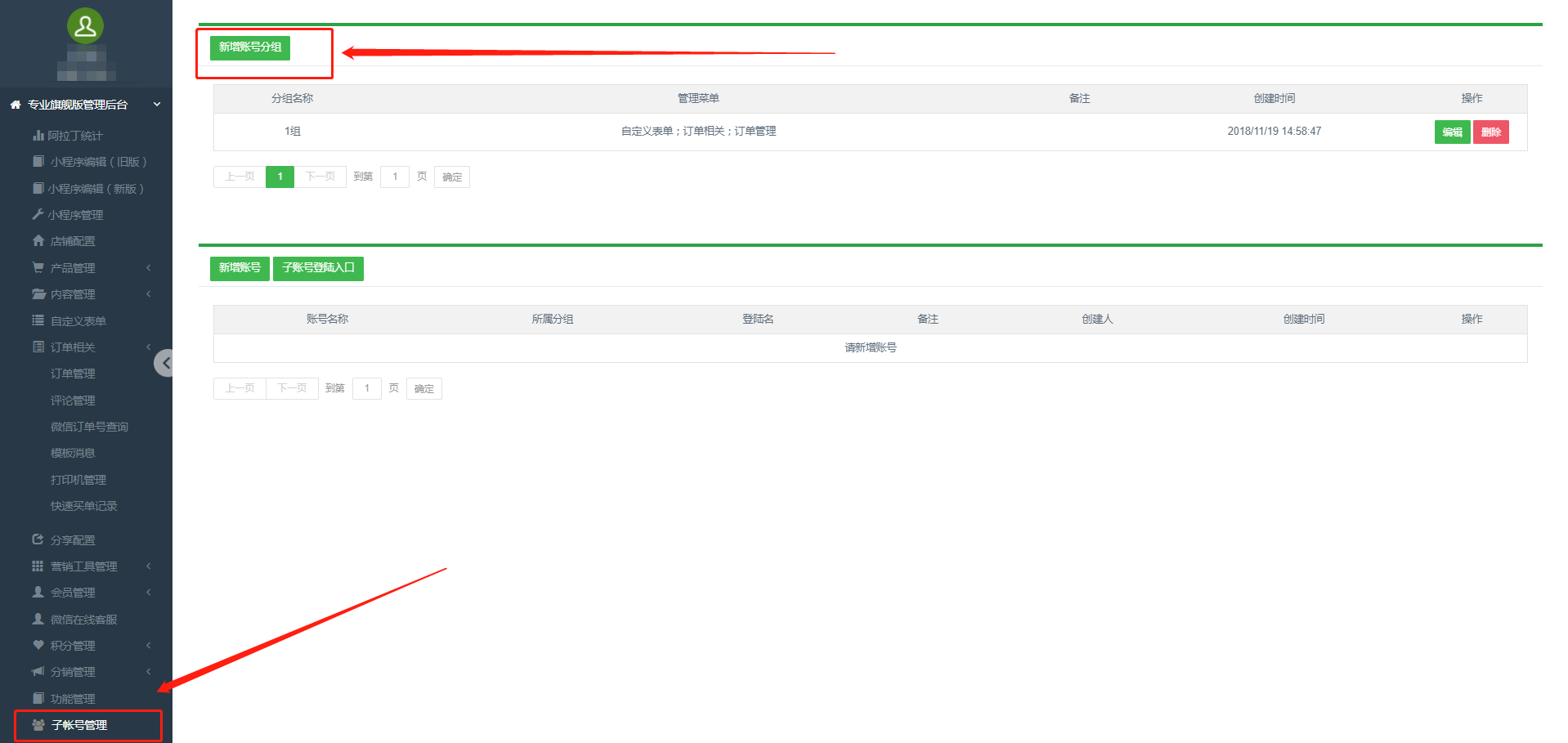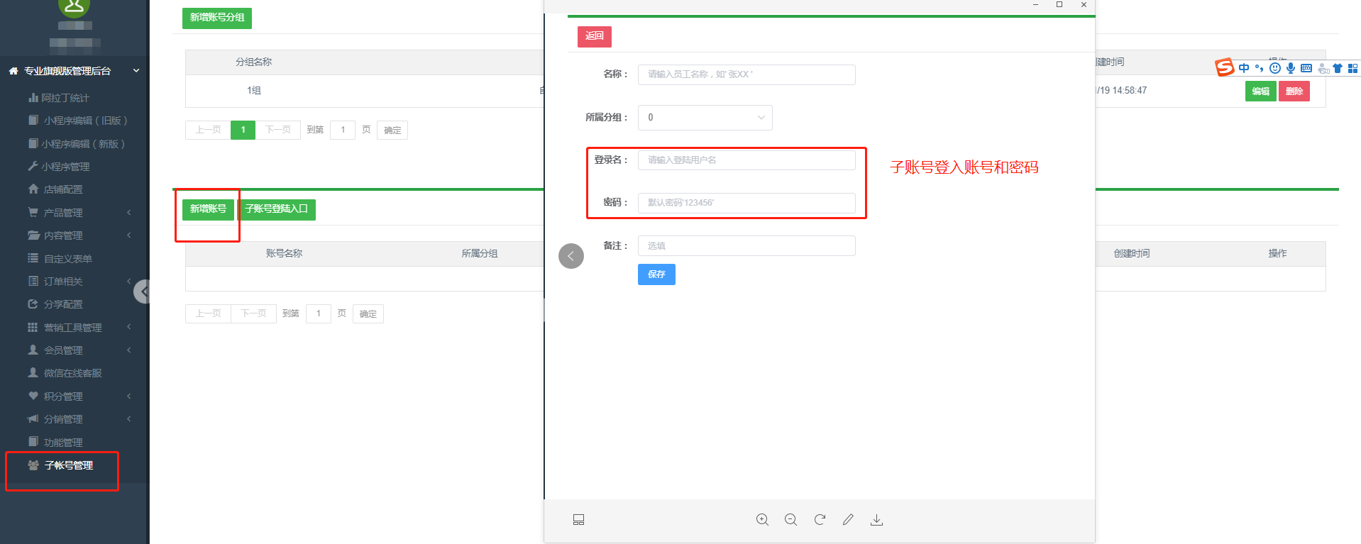 专业版子账号:如商家模板编辑之后,只想让员工或者客服登入登入去查看订单或者只操作其中一部分权限,可以设置针对该专业模板的子账号