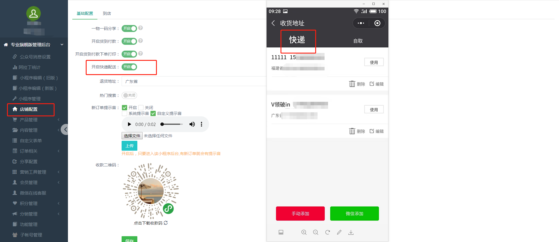 商家商品是否需要快速配送由商家自己决定,可以快递配送就在后台开启,不想配送就关闭。如果开启,在下单的时候就可以填写自己的收件地址,如果关闭,下单的时候就无法选择快递配送,只能选择其他方式取货(到店自取或者到店消费)