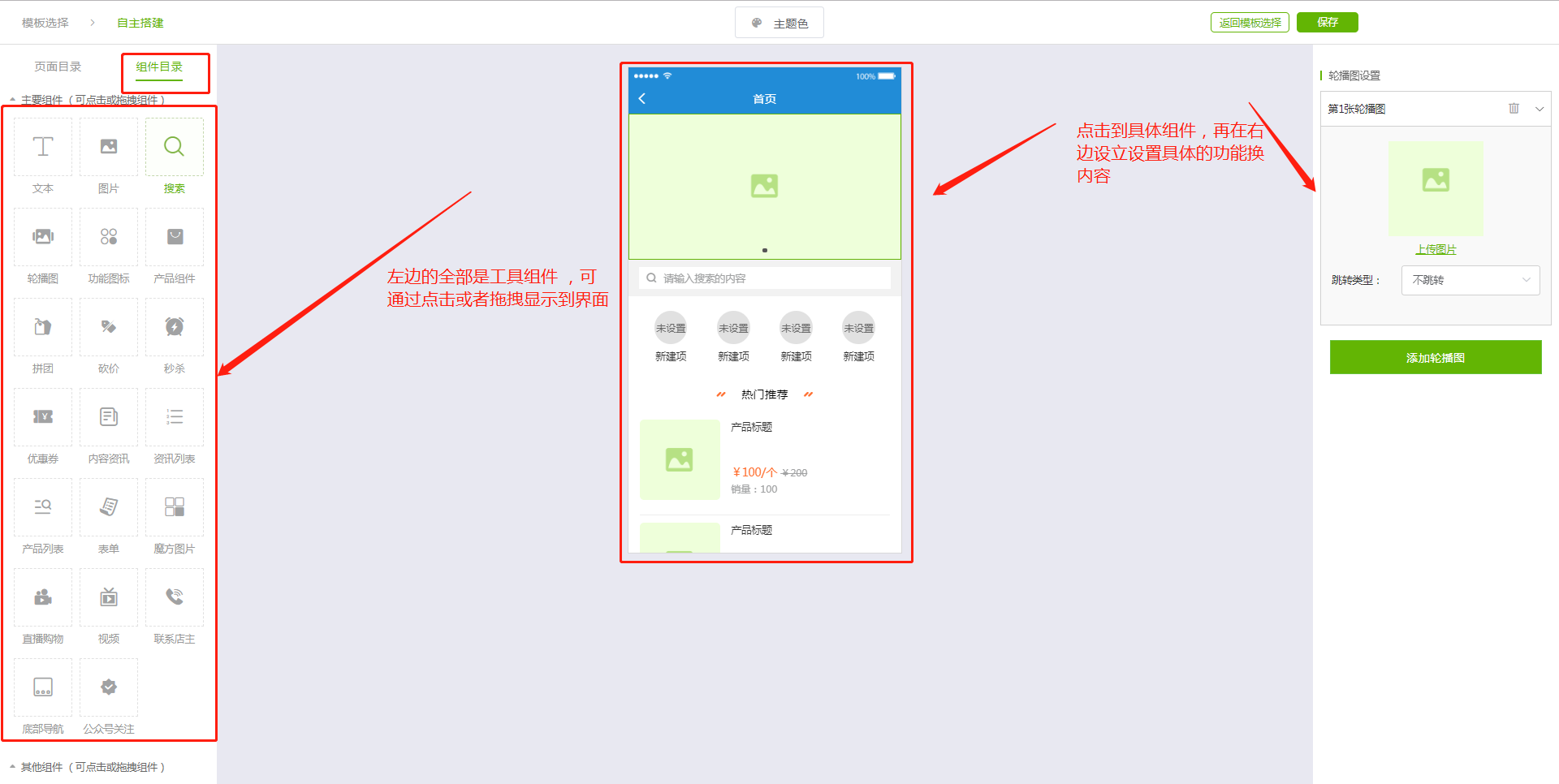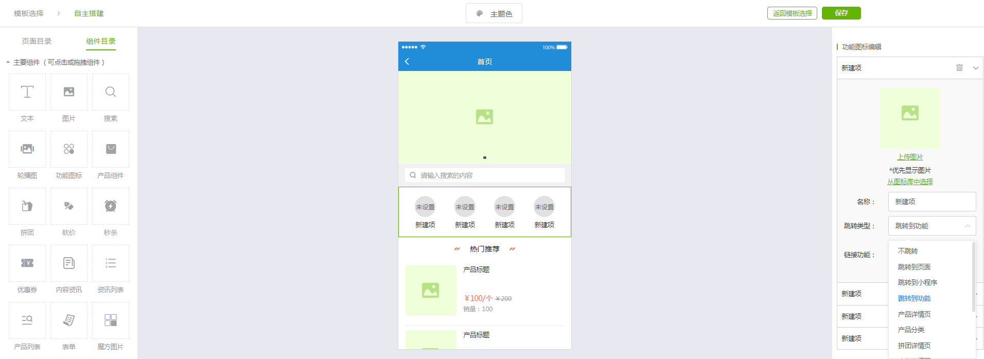 图片、功能图片、轮播图、底部导航:可以设置跳转,可以跳转的功能有:跳转页面、跳转小程序、跳转到一个功能(去支付、积分商城、分销中心、扫码购物、购物车、去储值)、跳转到产品详情页、跳出产品分类、跳转到砍价详情页、跳转团购详情页、跳转到产品小类、跳转到秒杀活动、跳转到内容资讯