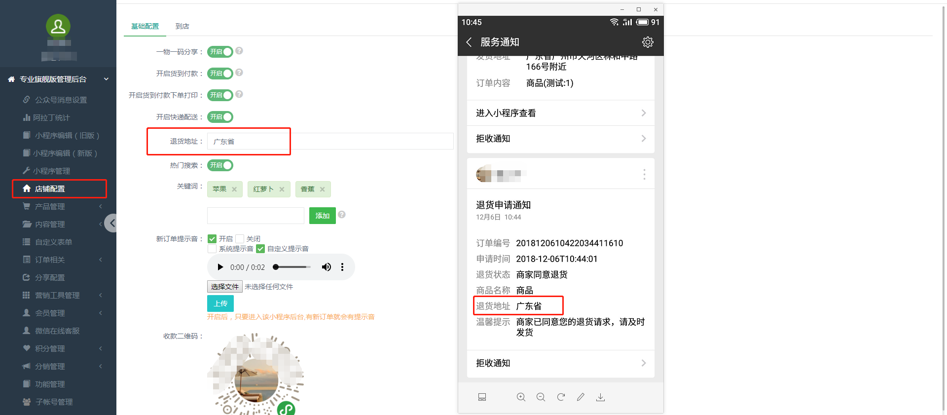 购买商品退货时需要把货品退回商家,这个是商家的收货地址。在商家同意客户退货操作时,会显示到微信服务号那里。