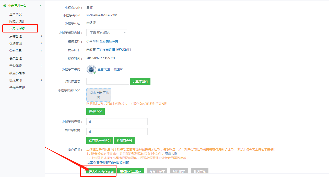 进入小程序授权-最底部点击“进入个人操作界面”: