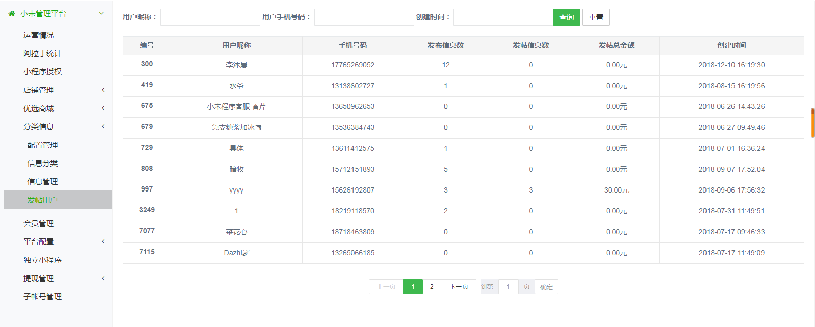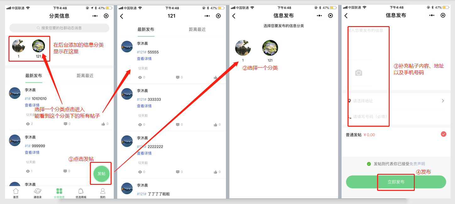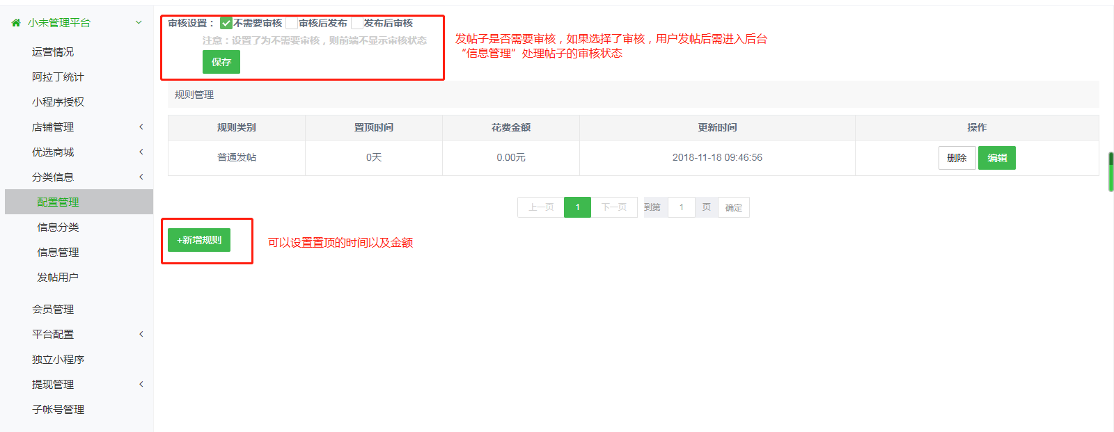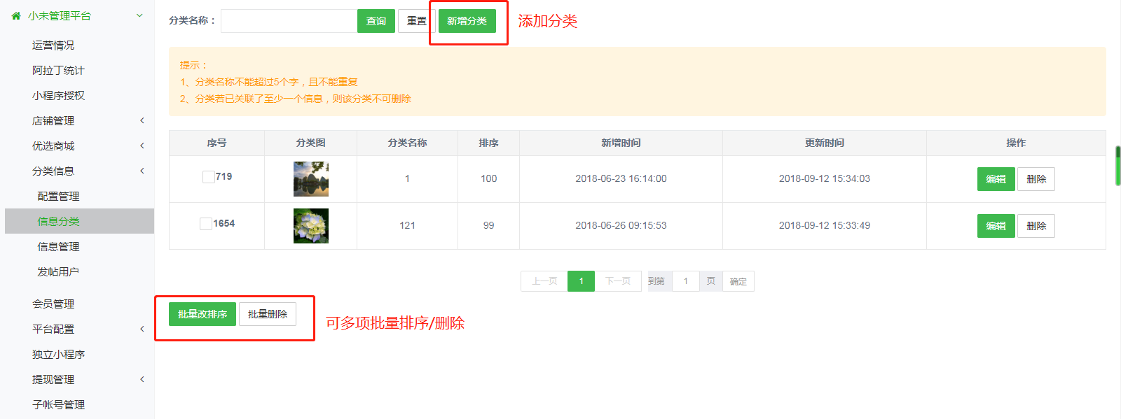 ②信息分类:用于用户进入小程序发布帖子选择在哪个分类下发布帖子
