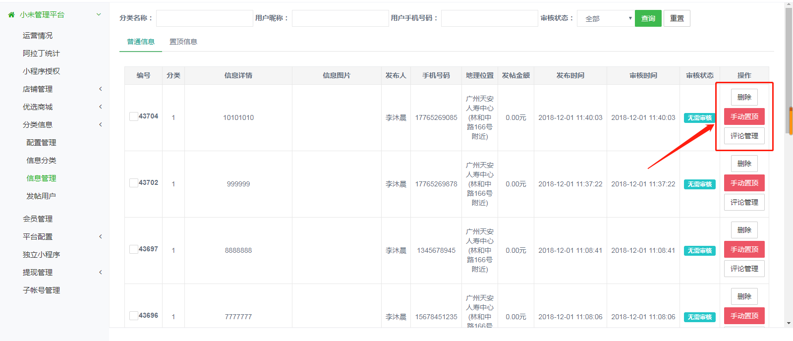 ③信息管理:处理帖子的审核状态、删除、手动置顶、评论管理