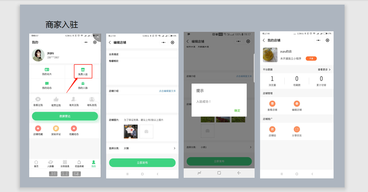 ①店铺分类:用户入驻到平台时需要选择入驻在哪个分类下。