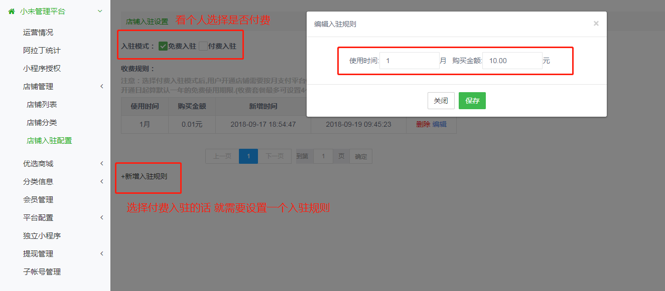 ③店铺入驻配置:可选择是免费入驻还是付费入驻