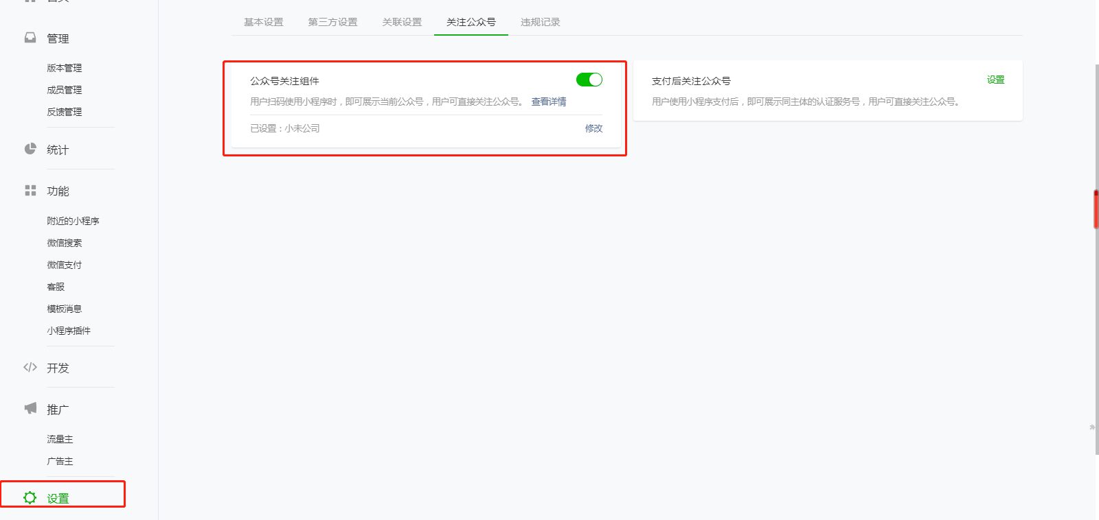 - 使用组件前,需前往小程序后台微信的小程序后台 在设置-关注公众号组件中设置要展示的公众号