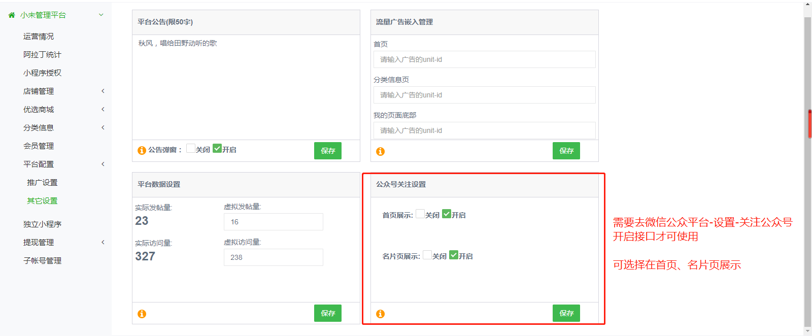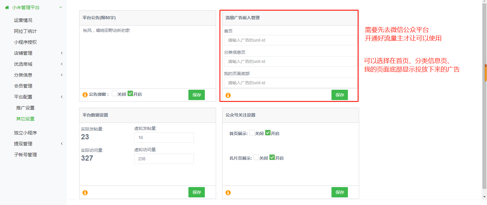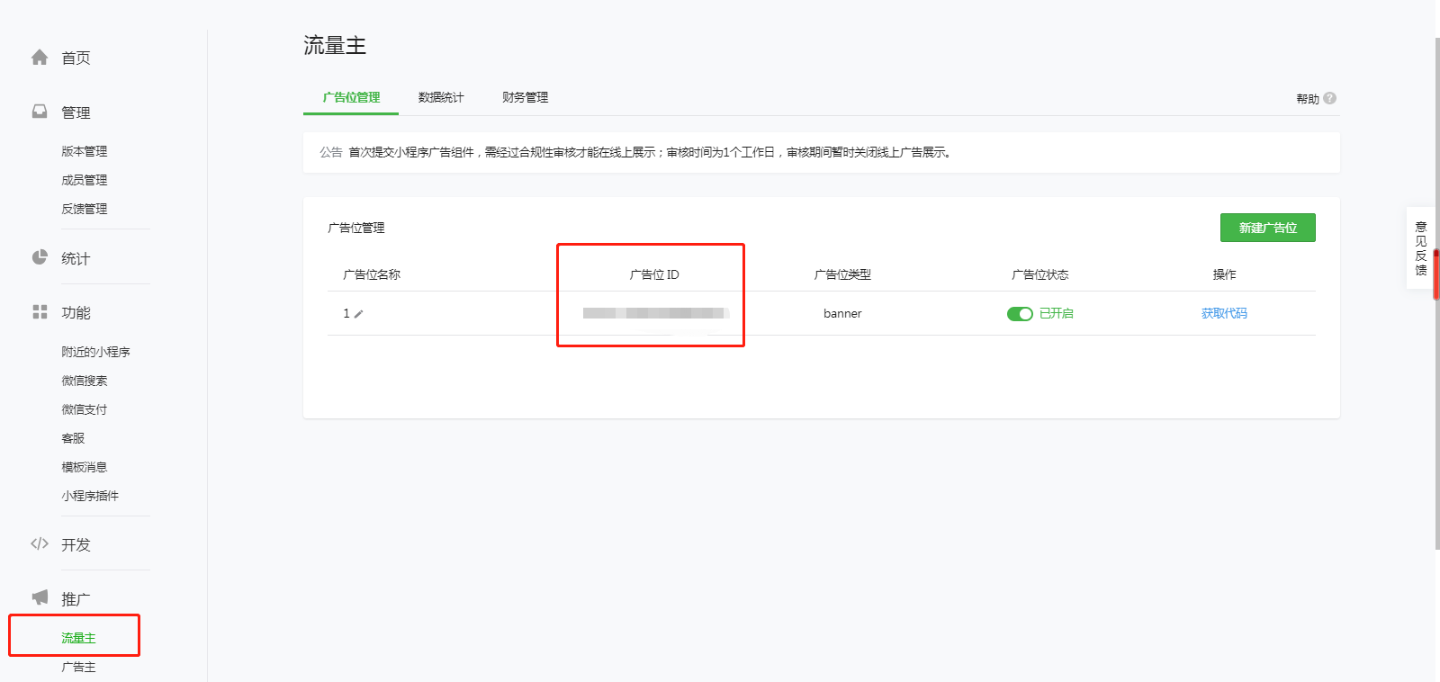 流量广告嵌入管理:需要使用此功能,请先登录微信公众平台-开通好流量主功能后才可以使用。开通之后,会有一个广告id