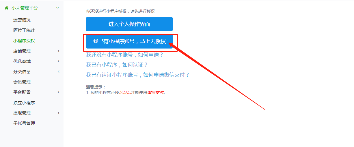 进入后,找到“小程序授权”选择”我已有小程序账号,马上去授权”