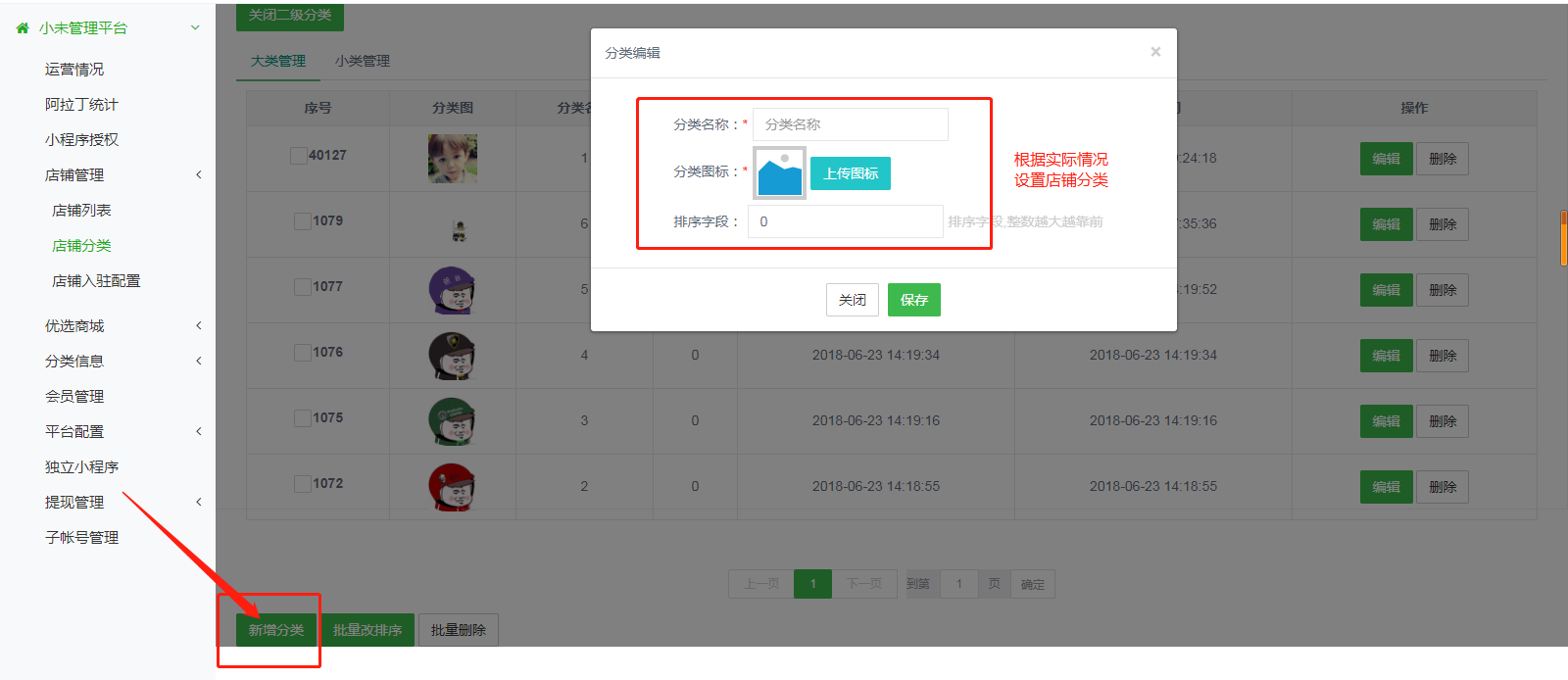 注意:大类和小类都需要设置。先设置大类再设置小类(例如大类为美食,小类为火锅、烧烤等)