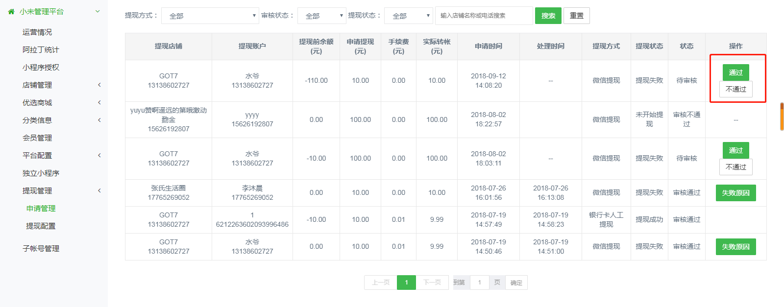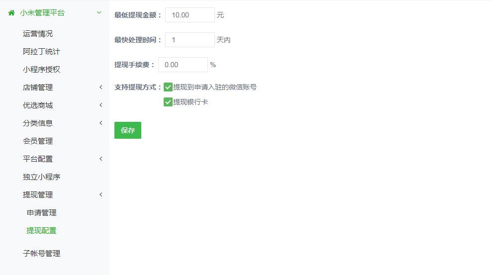 提现配置:平台管理者可设置最低提现金额、提现处理时间、提现手续费、提现方式