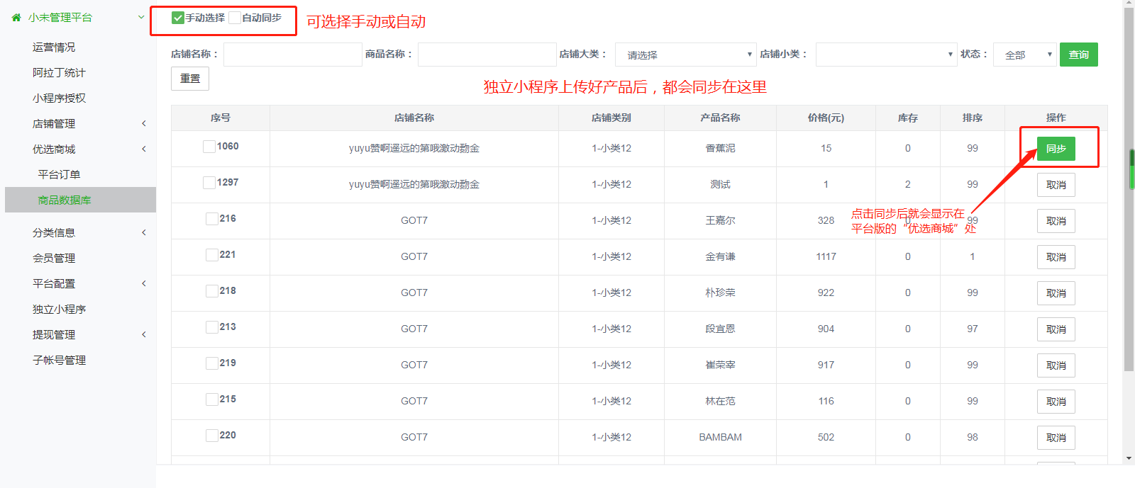 ②商品数据库:必须开通了独立小程序才能上传产品展示在平台的“优选商城”处。