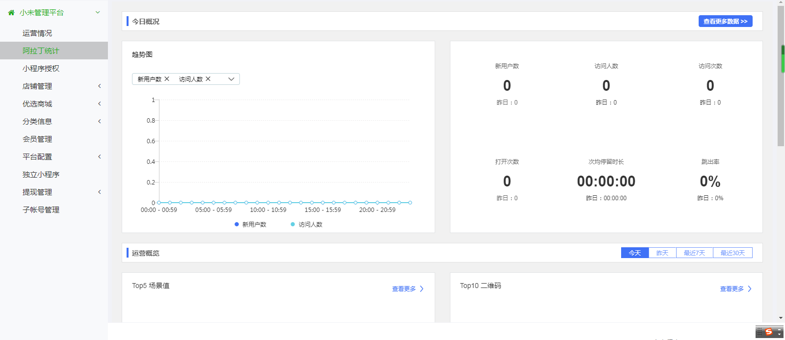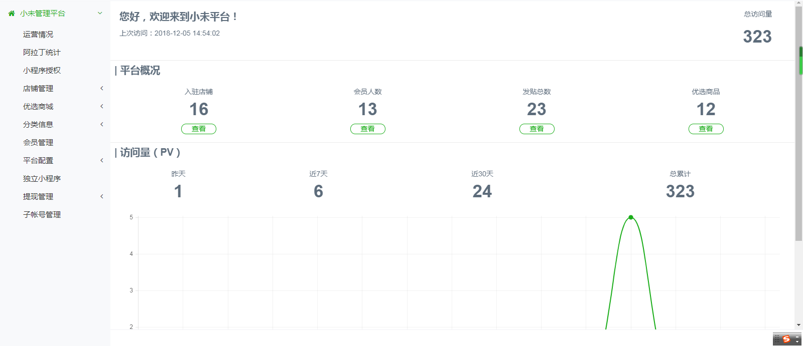 在这个页面 能清楚看到你的平台运营情况。例如:入驻店铺、会员人数、发帖总数、商品、访问量等等。