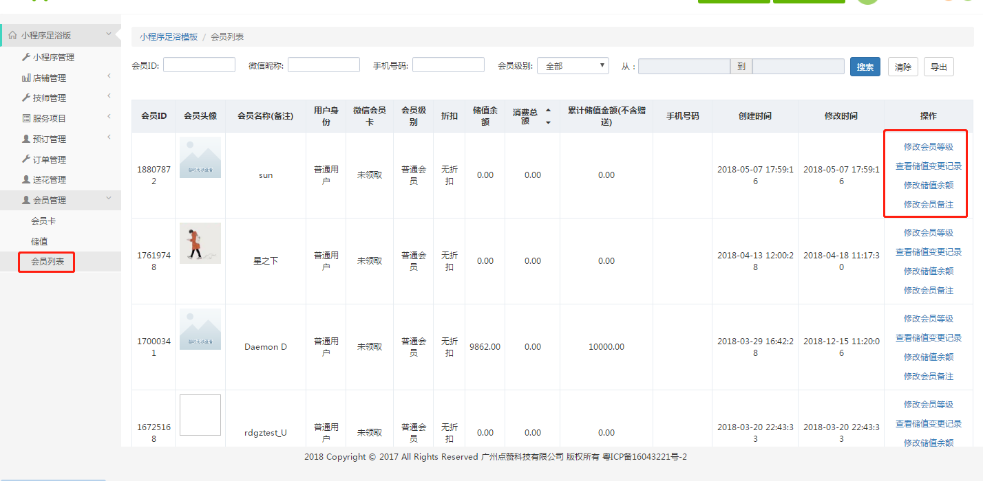 可以修改会员等级、查看储值变更记录、修改储值余额、修改会员备注