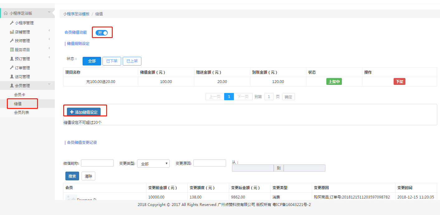 商家在后台添加好储值设定(充值多少钱赠送多少钱)上架的状态后,用户在我的页面可选择来充值,充值之后用来在小程序内消费,储值设定不超过20个