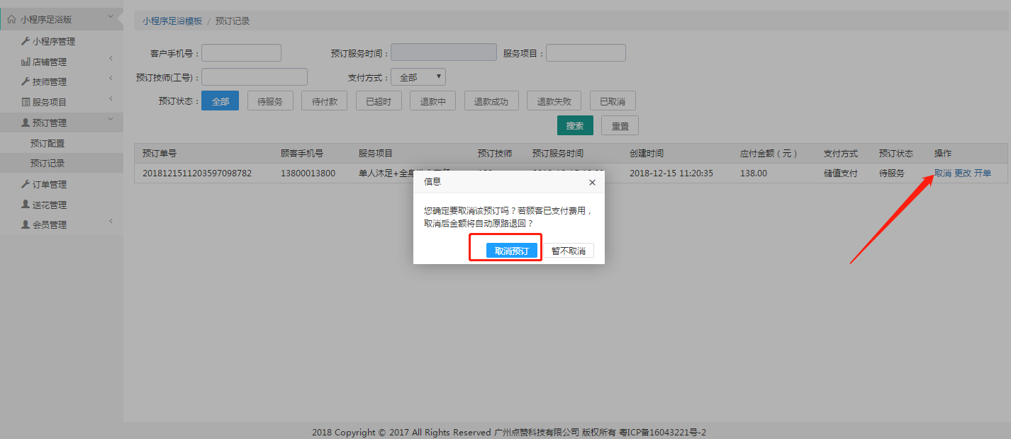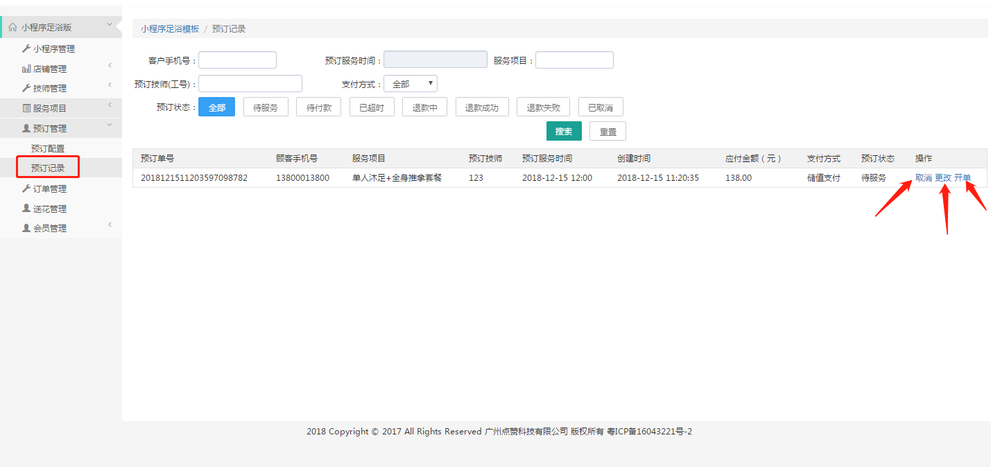 用户在小程序里预约之后,可以查看顾客的预约记录单,通过客户手机号码,预约时间,项目或者预定状态等进行搜索
