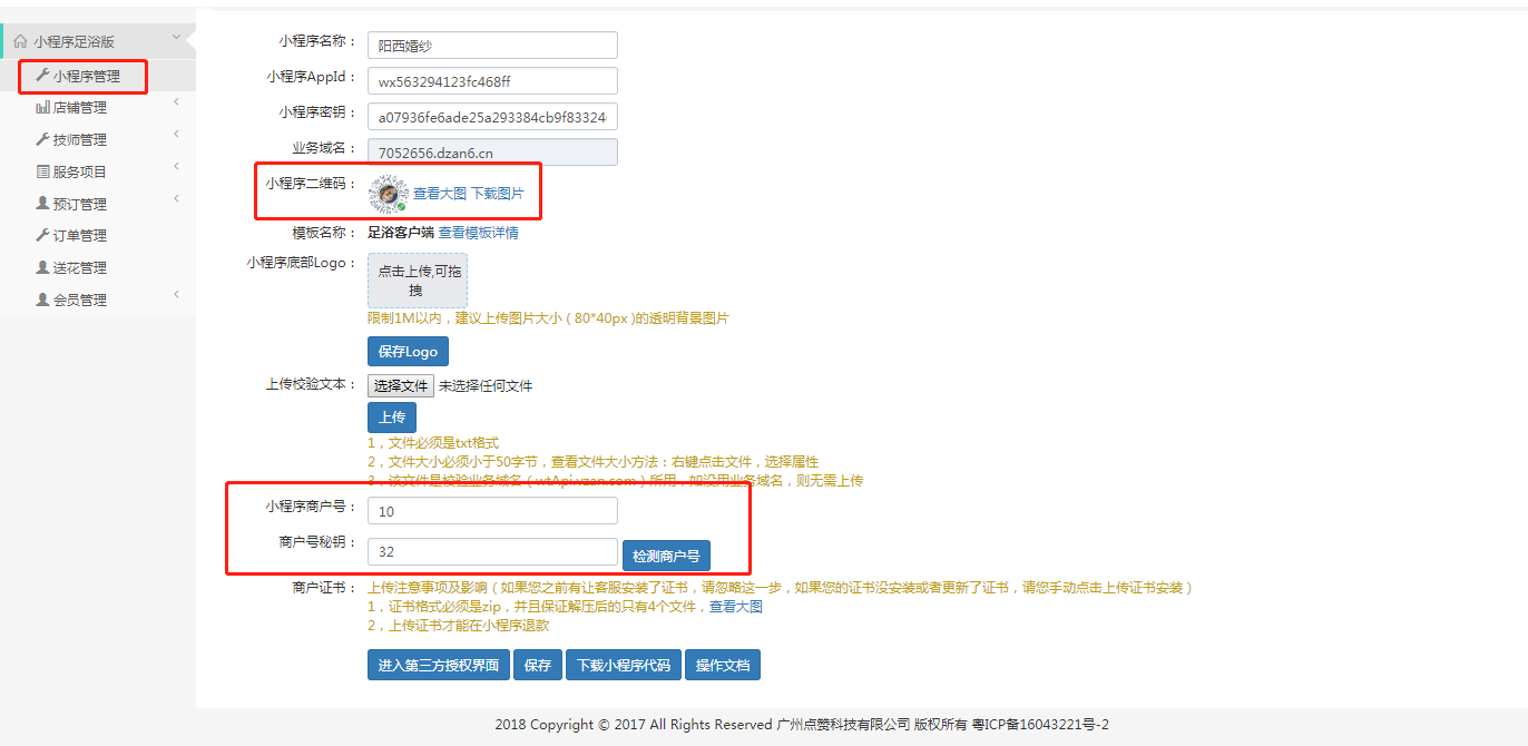 在小程序管理页面完善小程序名称、小程序appid、小程序密钥(appid和密钥在微信小程序公众平台-开发-开发设置获取)