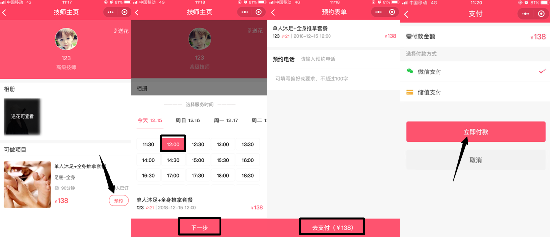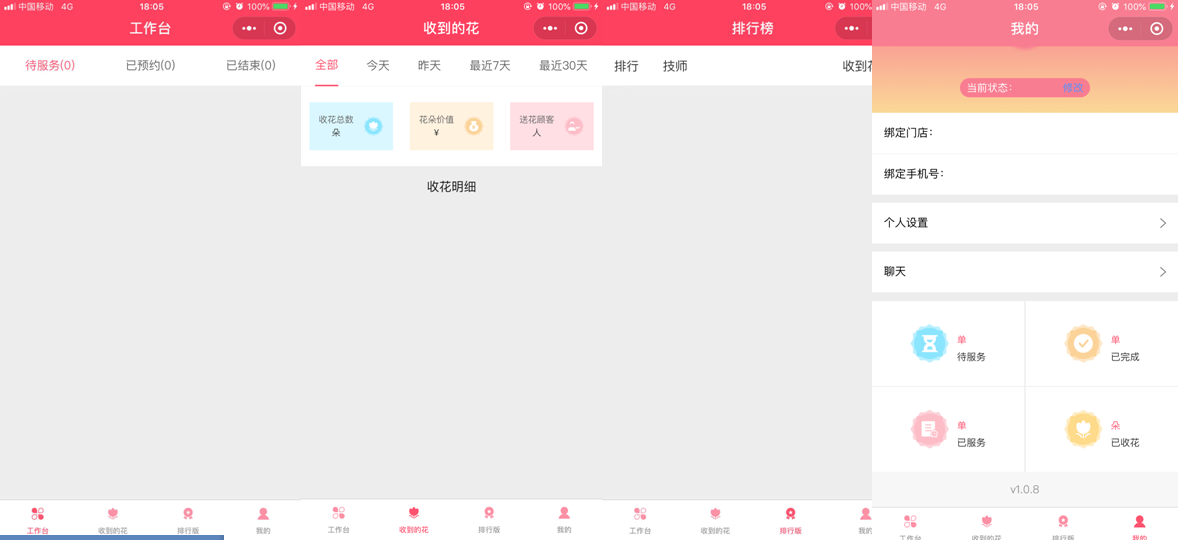 当有客户预订项目或送花时,技师可接收到微信消息通知。