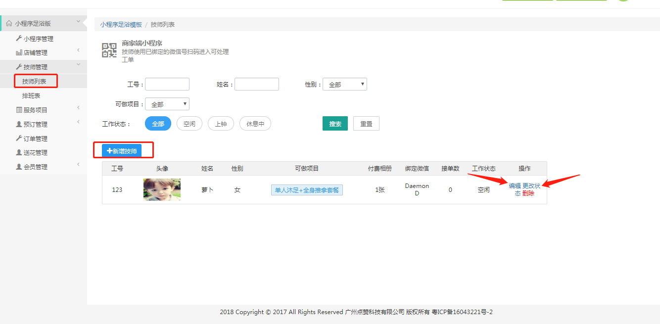 编辑进去可修改技师资料,更改状态是更改技师的工作状态