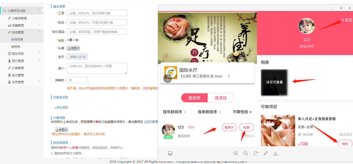 点击新增技师,填好技师基本信息,选择技师可服务项目,也可上传技师的付费相册(最多20张)用户在小程序技师详情页面送花之后可以查看,一朵花的默认价格2元,用户在小程序上可以私聊技师以及预约
