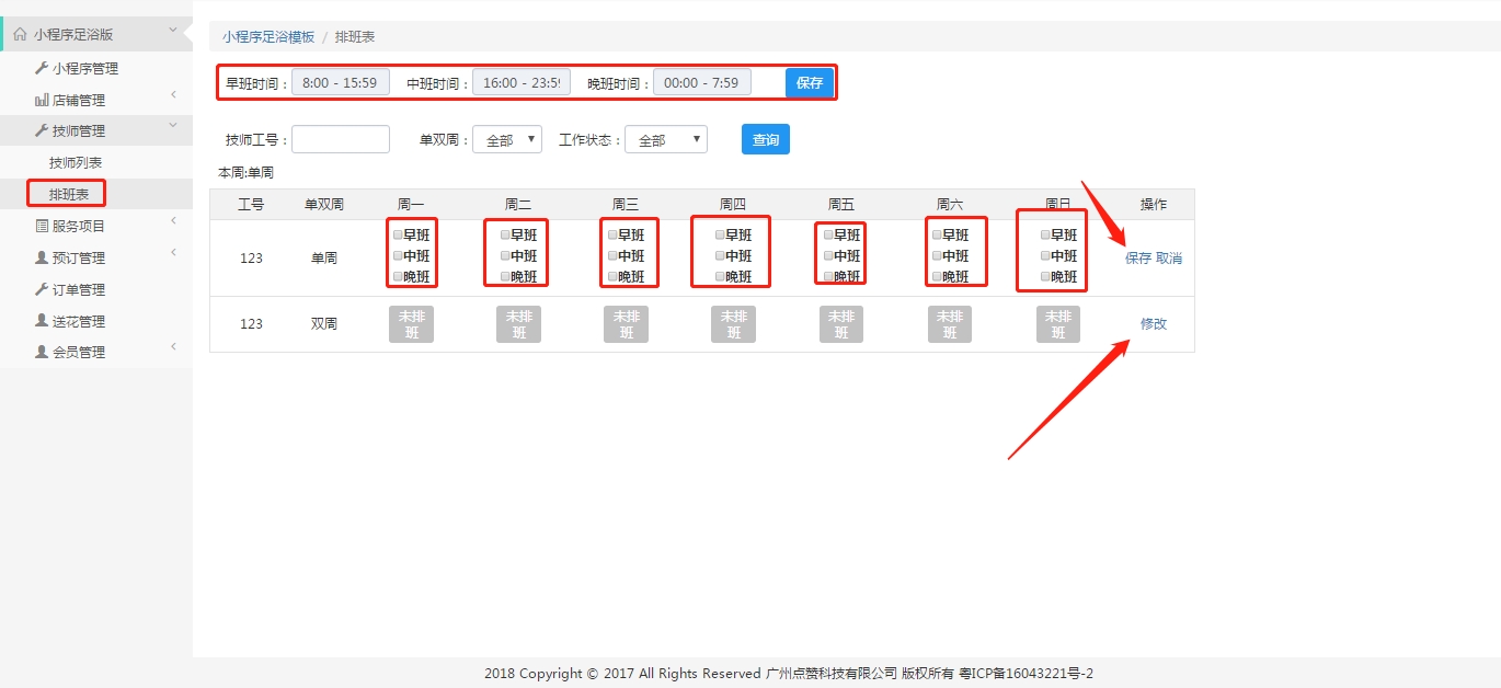 根据技师生成排班表,商家自己设定早晚班时间段,然后点击修改进去安排技师班次