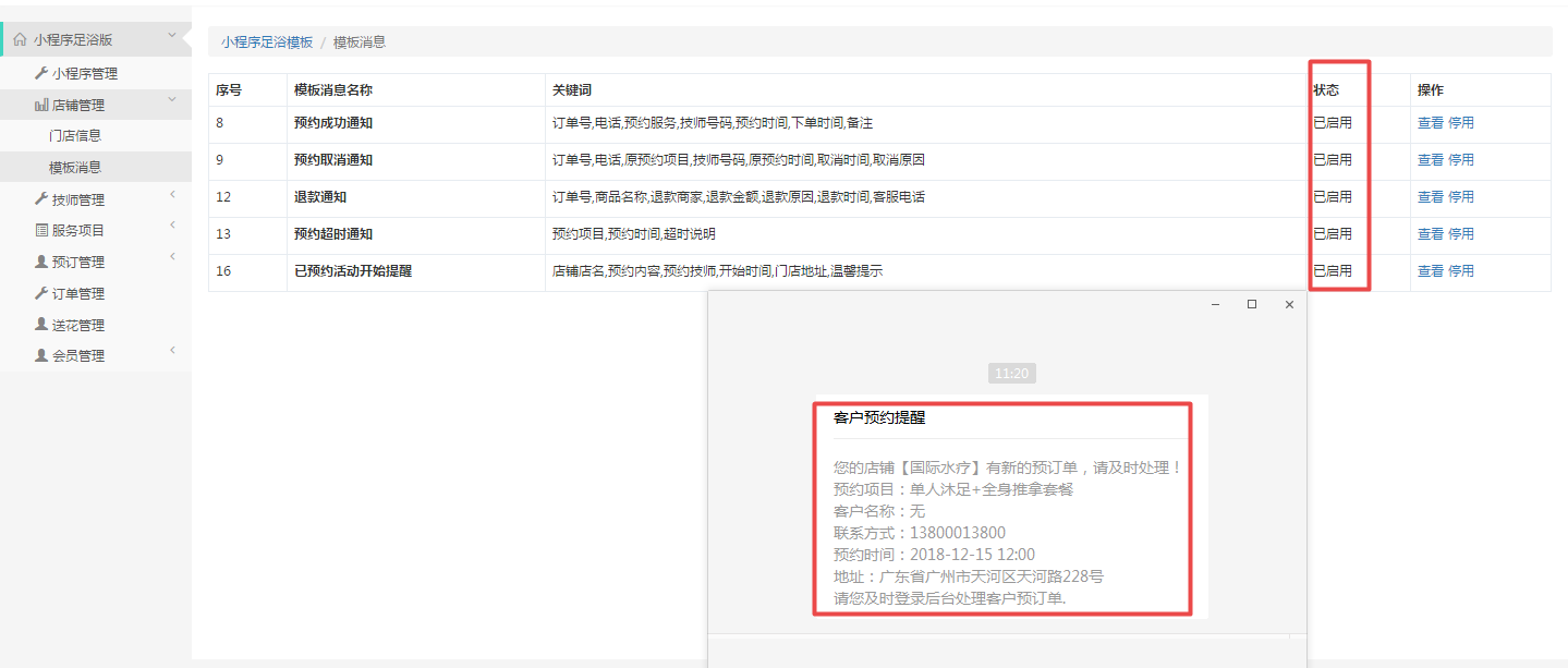 选择开启模板消息,可向顾客或技师发送订单模板消息