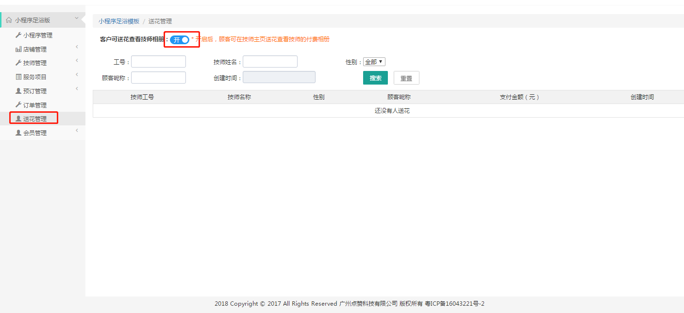 查看顾客给技师的送花记录,根据检索条件快速查找相匹配的送花数据
