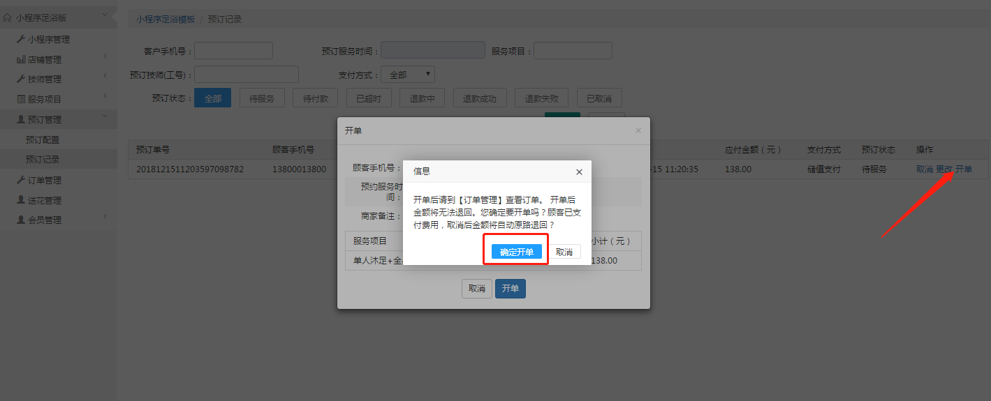 开单就是接单了,这个预约单会转到订单里,开单之后客户微信会收到预约成功通知
