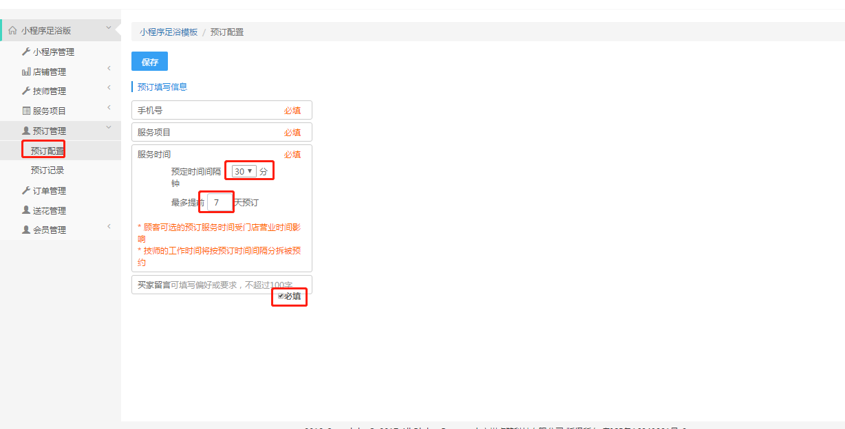 可以根据项目来设置技师再次被预约的时间间隔,设置可提前预定的时间已经这个买家备注是否必填