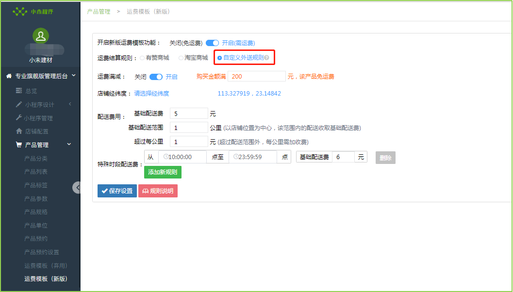 1、进入【专业版后台—产品管理—运费模板(新版)—自定义外卖规则】
