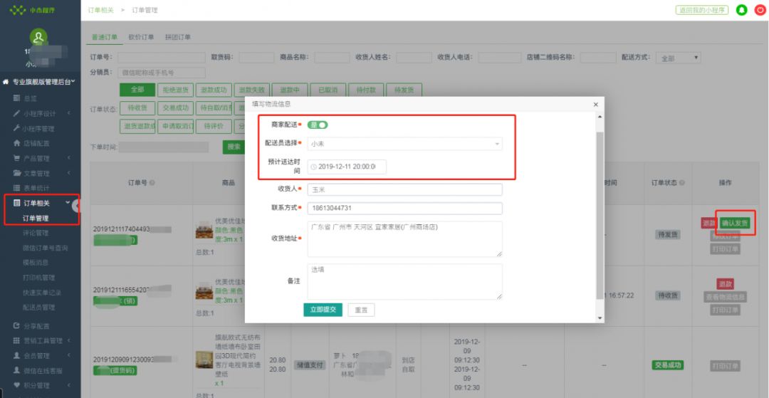 4、商家在【专业版后台—订单相关—订单管理】查看客户的订单,并发货配送,发货时可选择商家自配送并选择对应配送员
